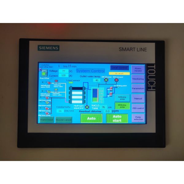 Sodium hypochlorite generator is a generator to produce sodium hypochlorite by brine or sea water electrolysis, and the whole system is a combination of softener, salt dissolving unit, brine proportion unit, control system, electrolytic unit, storage unit, dosing unit and acid washing unit. It's a system using salt as raw material to produce sodium hypochlorite liquid (0.8%) and dose into water for disinfection.